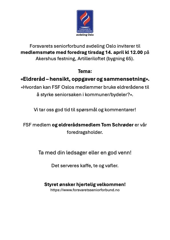 Årsmøte FSF Oslo 17 mars 2026 kl1200 på Artilleril